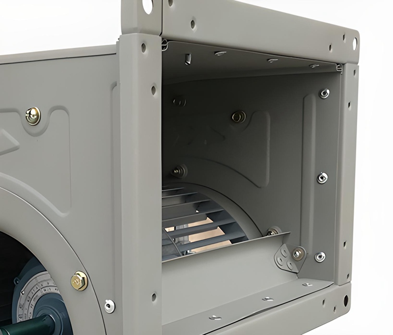 The square discharge outlet aligns easily with standard duct systems. Key parts are positioned for quick access, helping reduce downtime during routine checks.